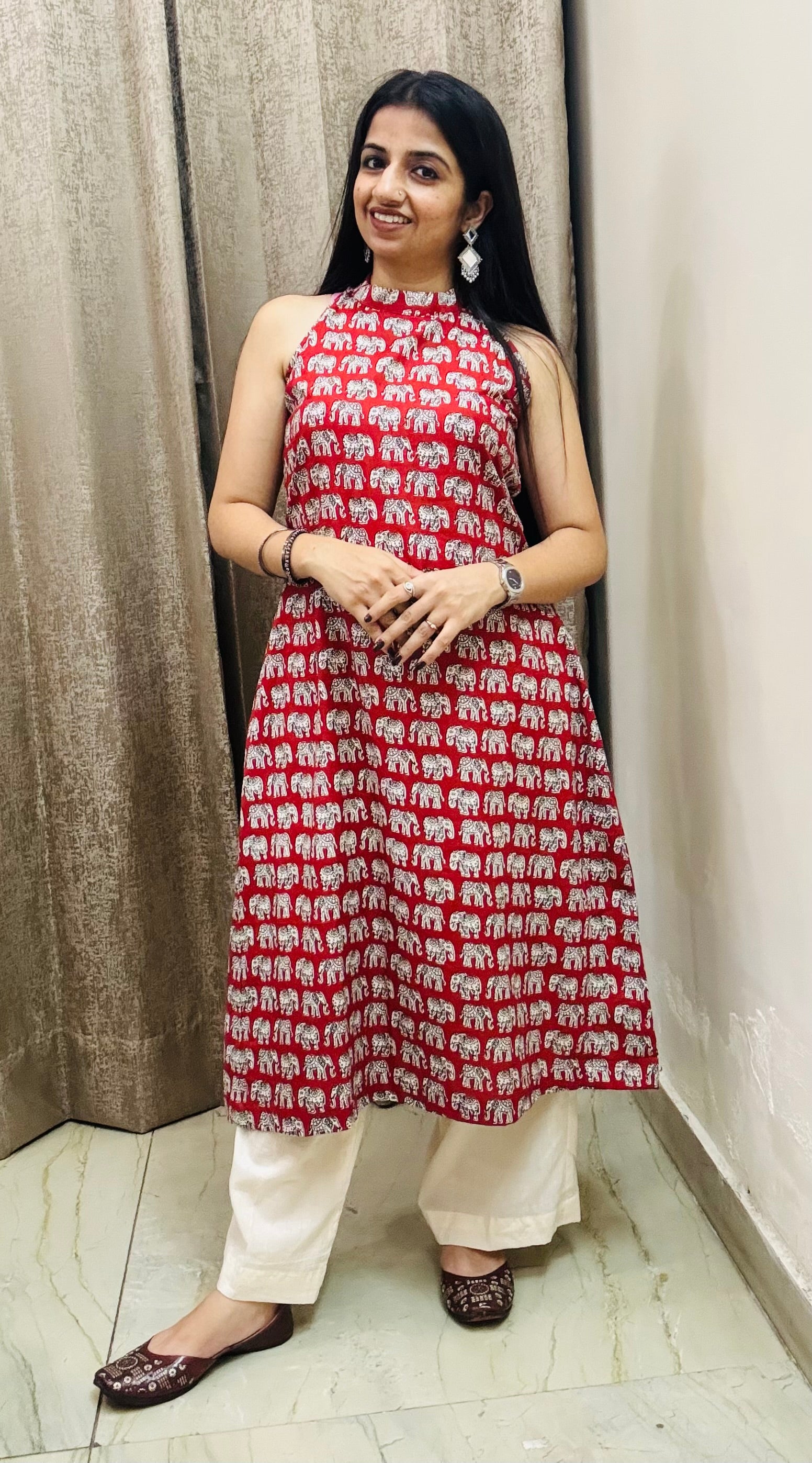 Step into comfort and style with our Cotton Halter Neck Kurta Set, featuring a charming elephant print and paired with wide-leg loose palazzo pants. Crafted from breathable cotton, this set offers effortless elegance and all-day ease, perfect for casual outings, festive gatherings, or everyday chic.