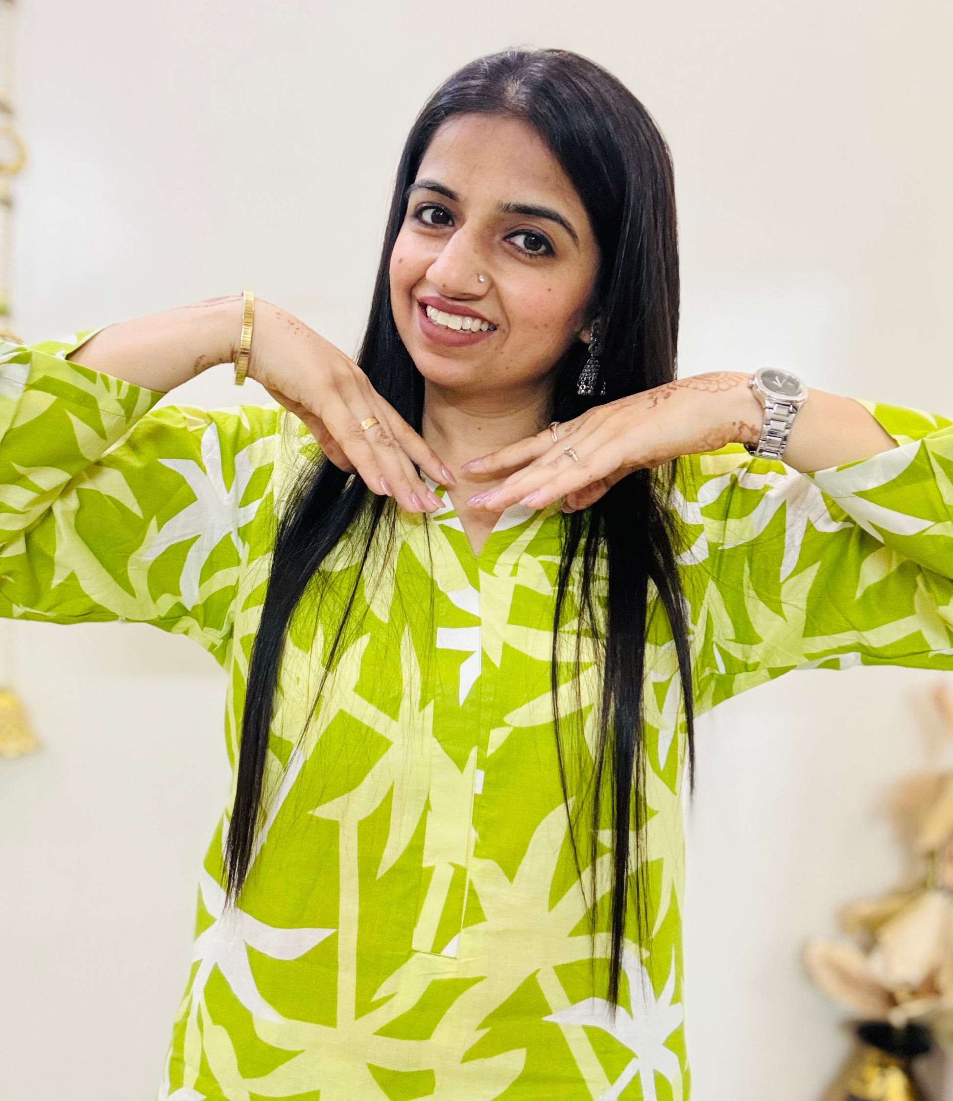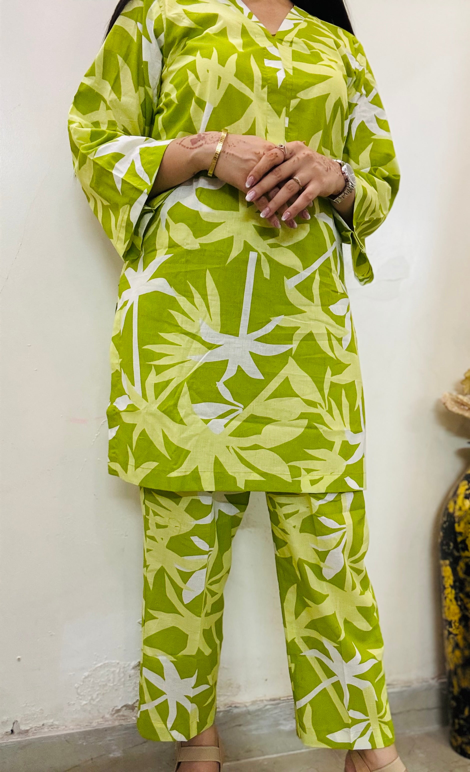 Step into the world of comfort and style with our Parrot Green Leafy Cotton Cord Set – a perfect blend of vibrant colors, chic prints, and effortless elegance. Designed in a refreshing parrot green hue with delicate leafy patterns, this co-ord set brings a breezy, nature-inspired charm to your everyday wardrobe.
