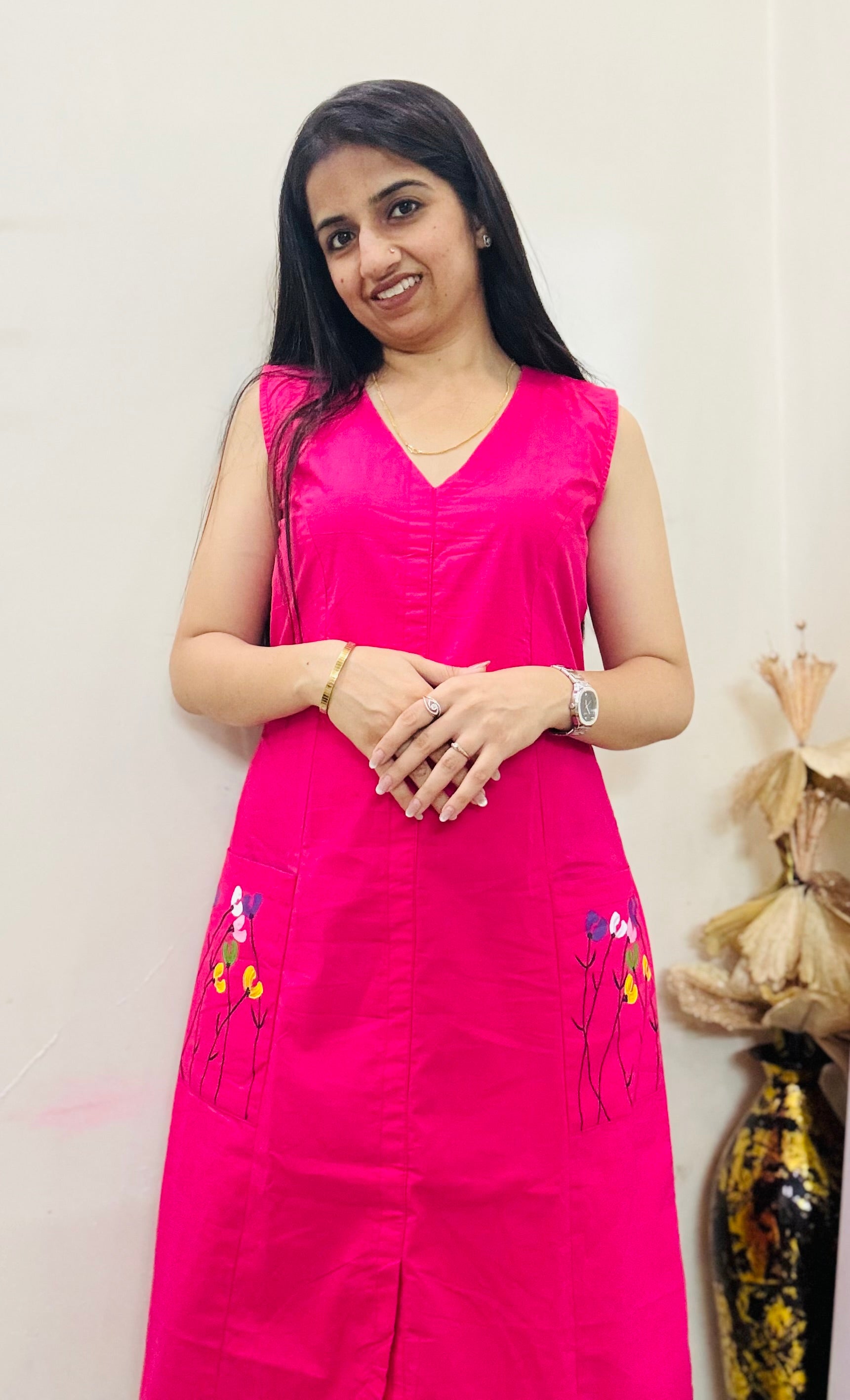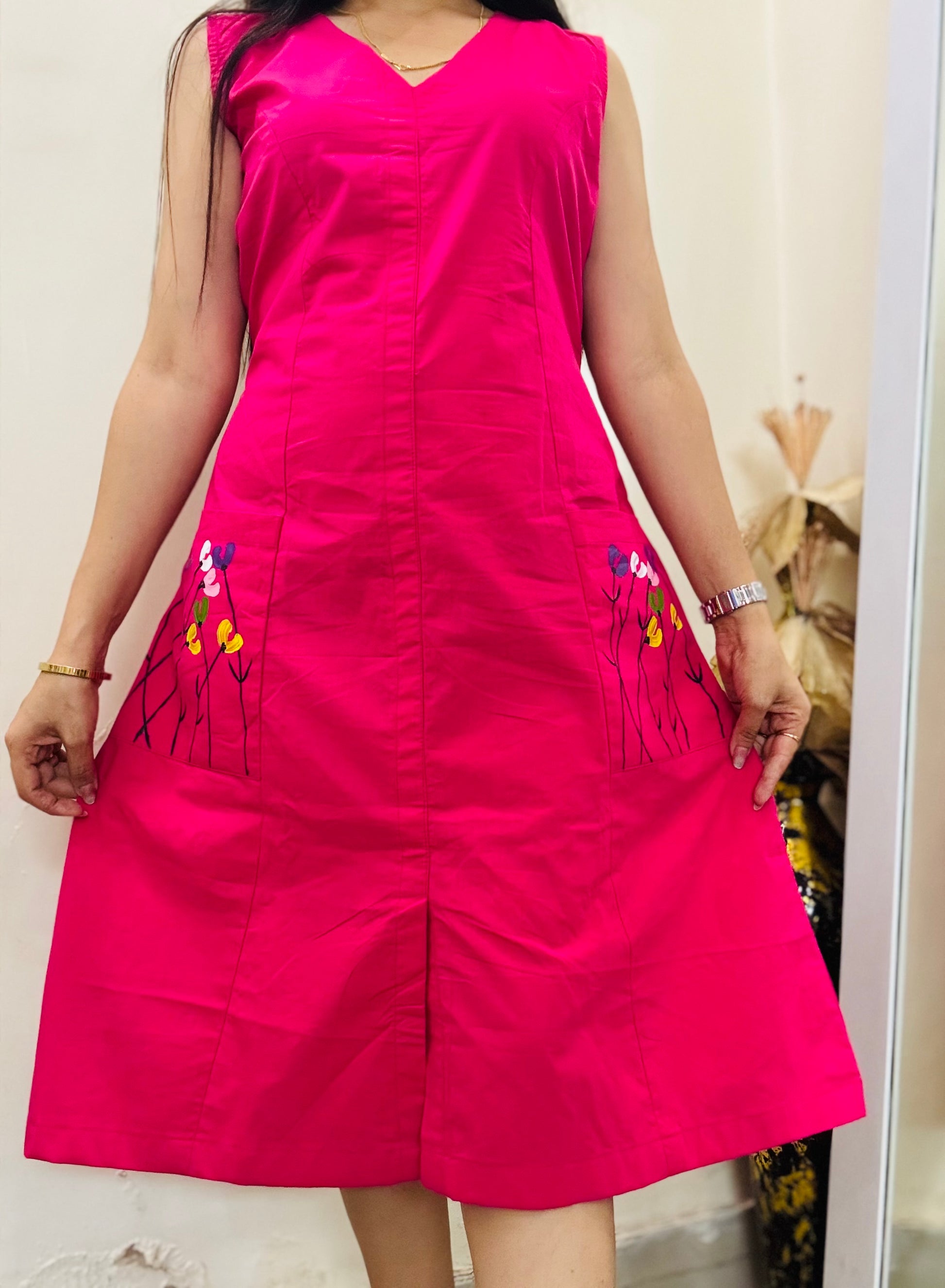 Introducing our very first hand-painted cotton knee-length dress – a perfect blend of comfort, style, and creativity. Designed with practical front pockets and crafted in breathable cotton fabric, this piece is as functional as it is beautiful.