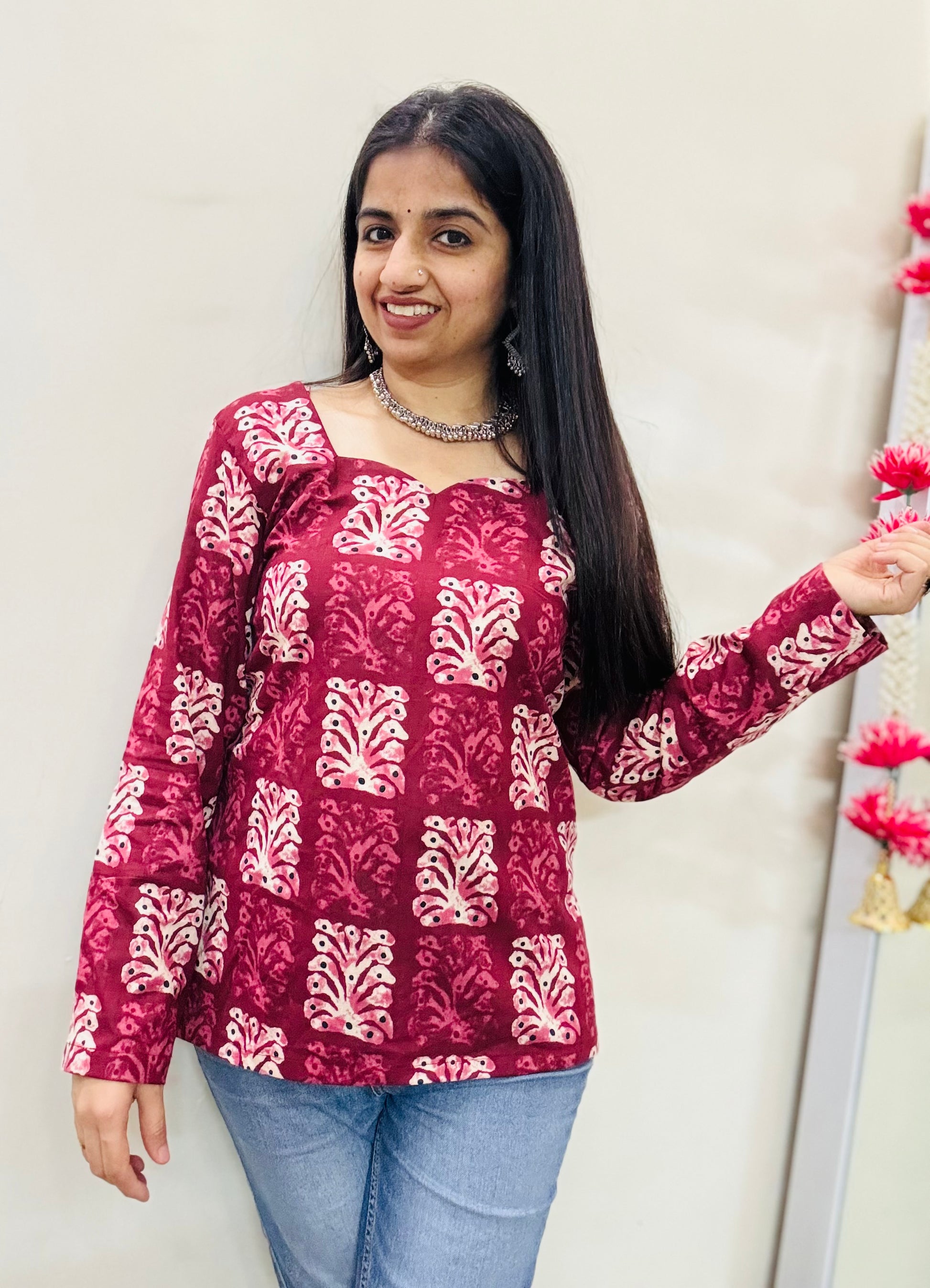 Add a pop of elegance to your everyday wardrobe with this Dark Pink Printed Short Kurti featuring a beautifully crafted corset back design. The vibrant shade enhances your glow while the intricate prints keep it classy and timeless.