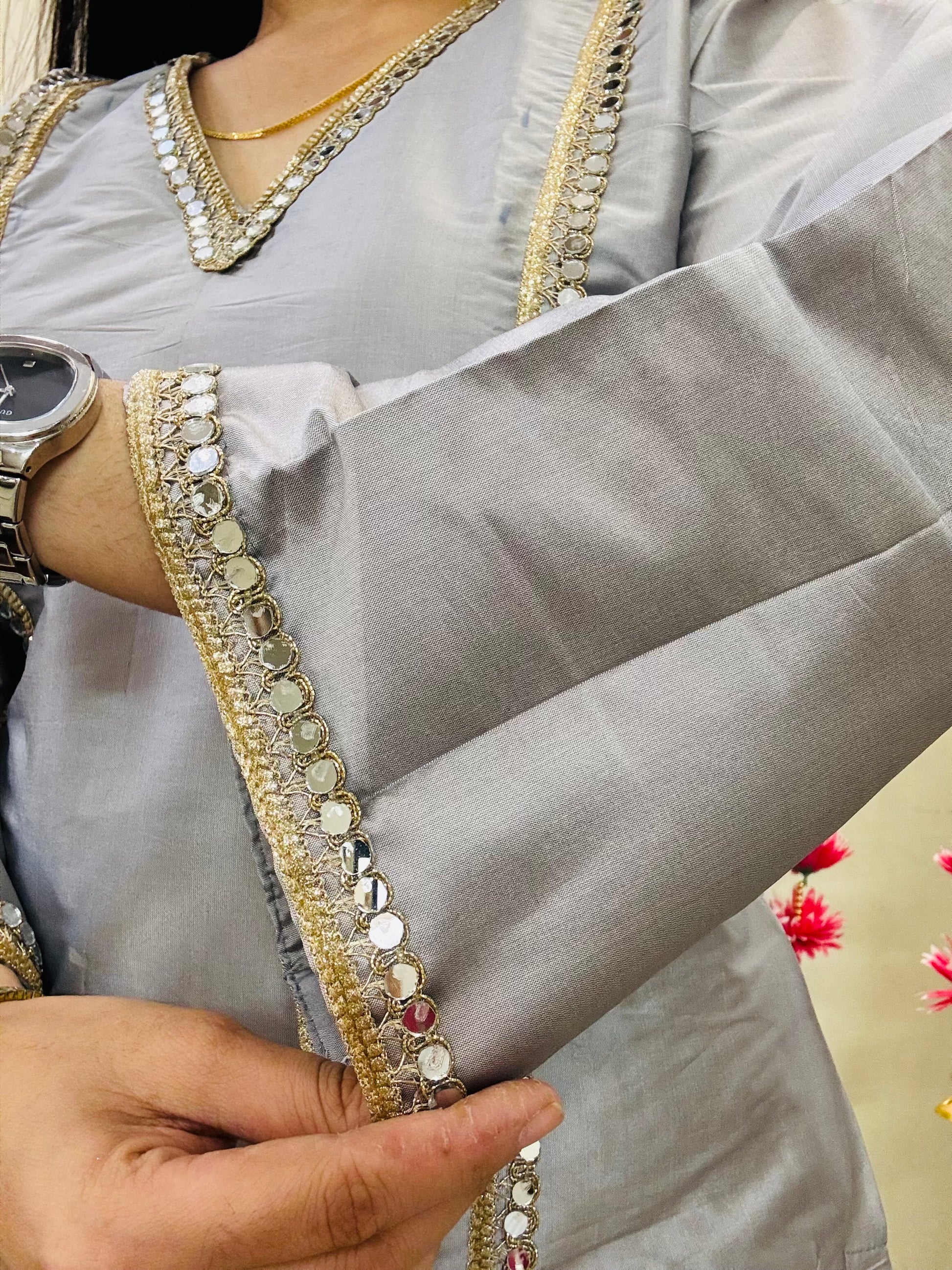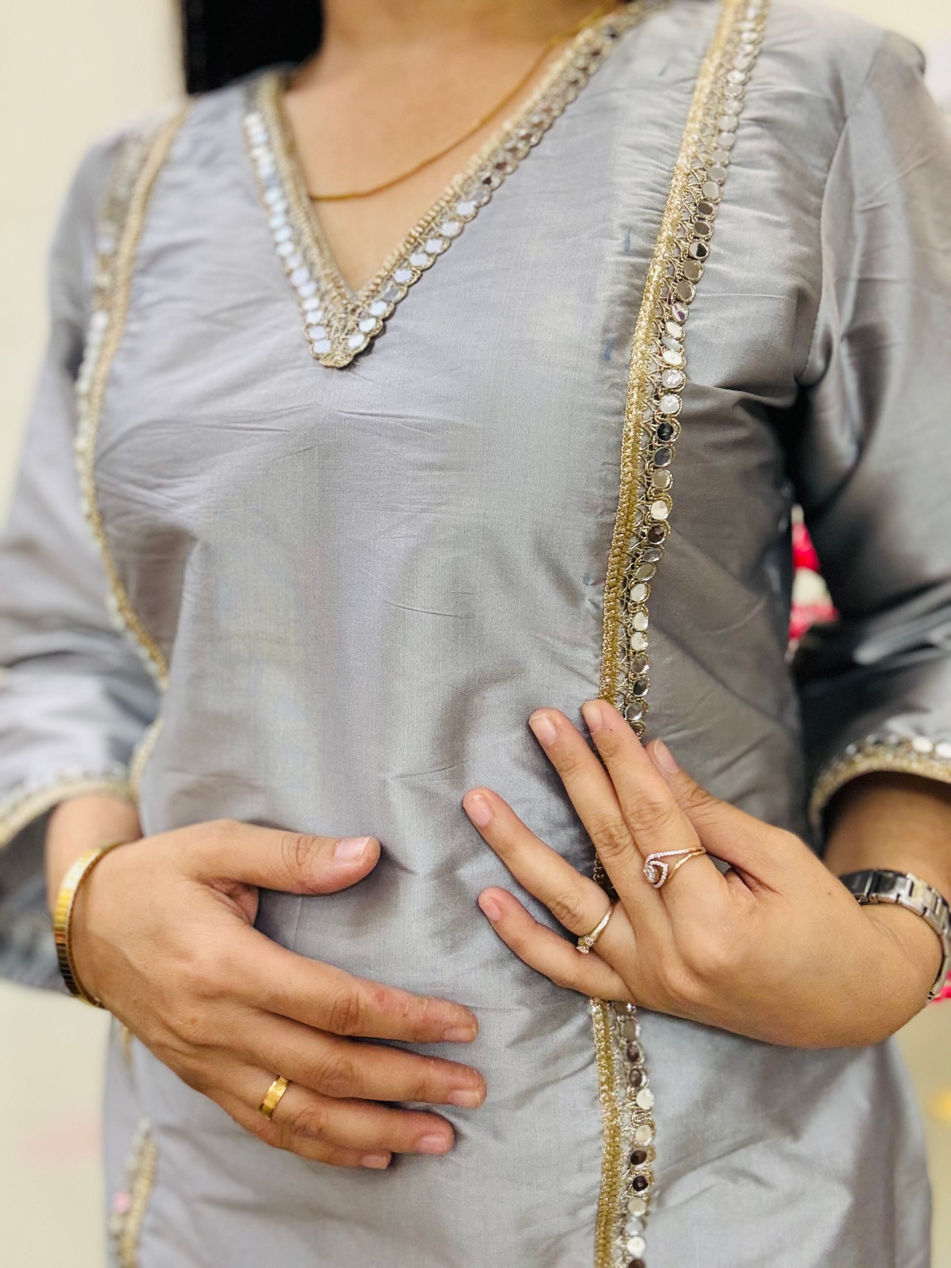 A premium Tafta silk coord set adorned with delicate mirror-work and lace detailing—perfect for celebrations, evenings, and festive nights. Designed to give a structured yet graceful silhouette with a luxe sheen