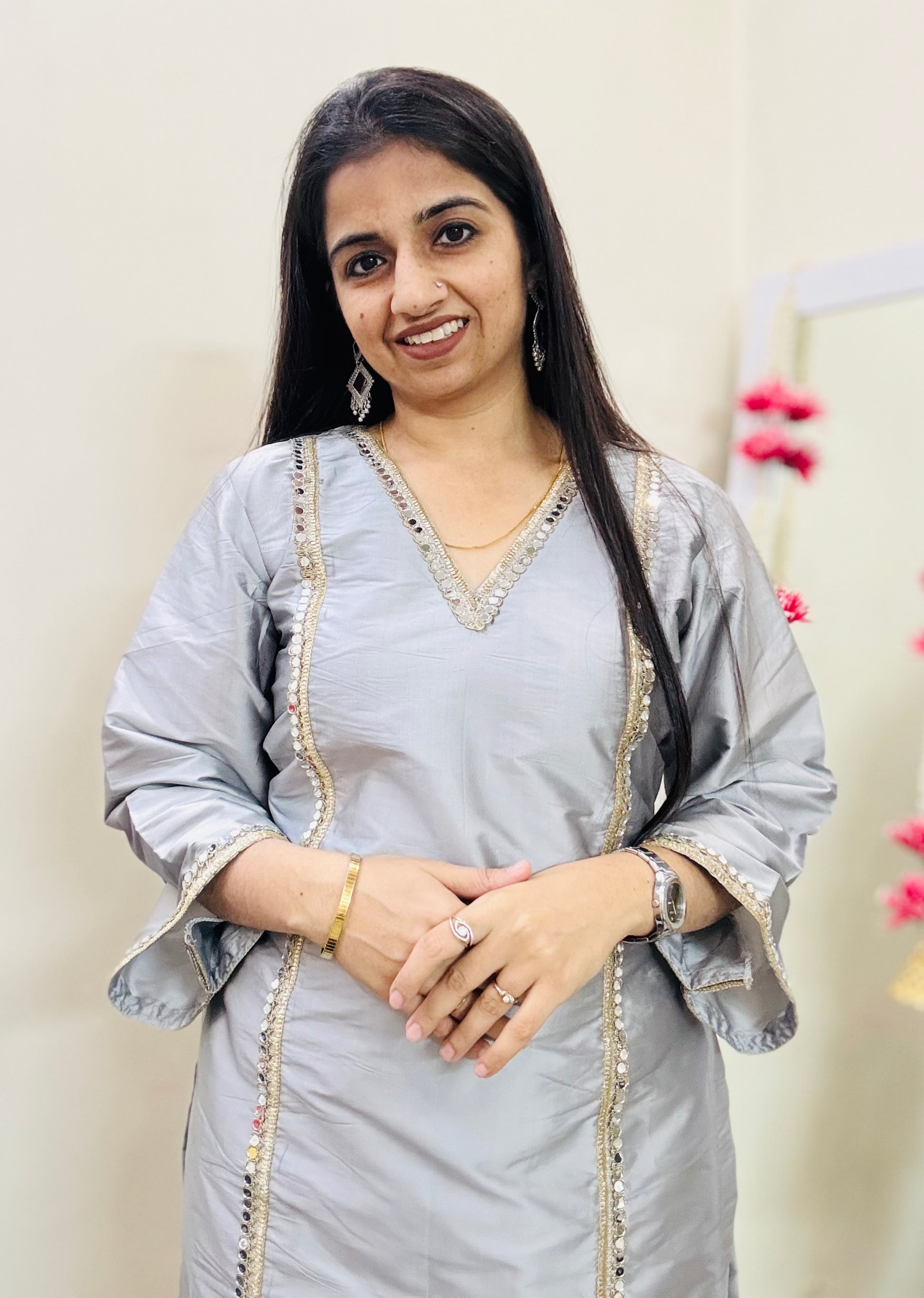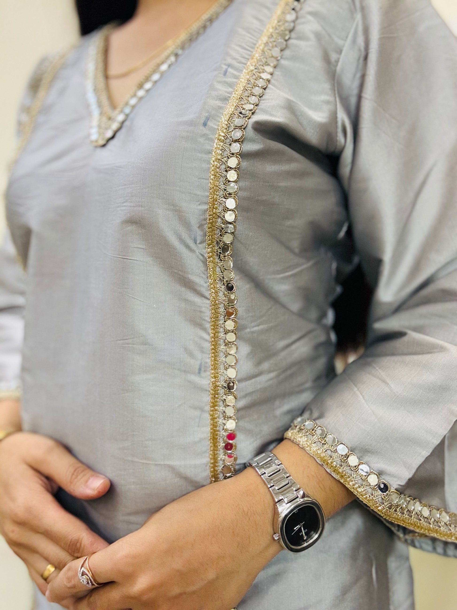 Color: Silver GreyFabric: Tafta SilkSize: S,M,L,XL,XXLInclusive: Top & Bottom